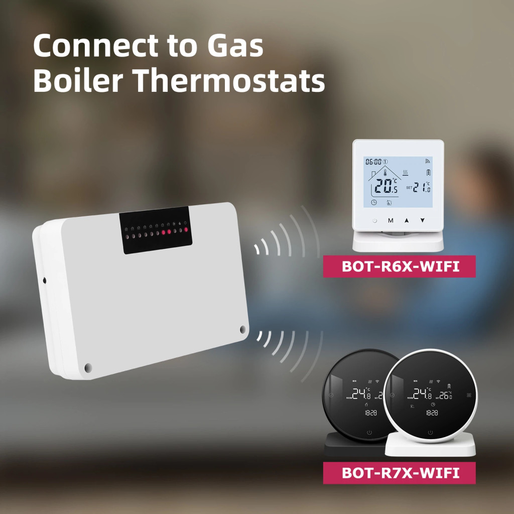 A CCT-28-X hub és a BOT-R6 , BOT-R7 sorozatú vezeték nélküli elemes termosztátok együtt használhatók vezeték nélküli padlófűtés vezérlőrendszerhez. Ez a kétféle termosztát rádiófrekvenciás jellel csatlakozik a CCT-28-X vezeték nélküli hubhoz, nincs szükség vezetékes csatlakozásra.