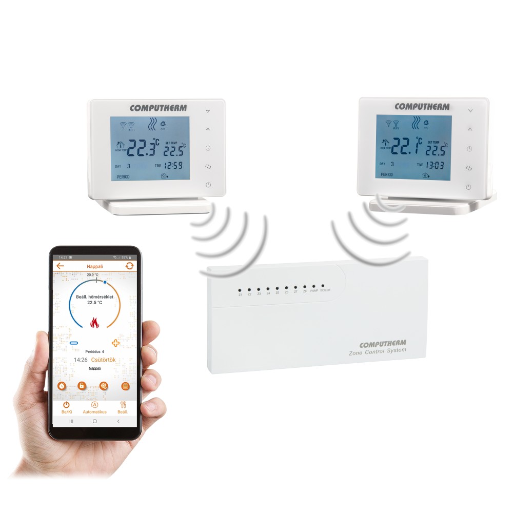 A COMPUTHERM E800RF típusú Wi-Fi termosztát egy interneten keresztül okostelefonról és tabletről is vezérelhető, 8 zónás vezeték nélküli kapcsolóüzemű készülék, melyet elsősorban fűtési illetve hűtési rendszerek vezérlésére ajánlunk, amely a Magyarországon forgalomban lévő kazánok és klímaberendezések túlnyomó többségének szabályozására alkalmas. Egyszerűen csatlakoztatható bármely, kétvezetékes szobatermosztát csatlakozási ponttal rendelkező gázkazánhoz, továbbá tetszőleges klímaberendezéshez vagy egyéb elektromos készülékhez függetlenül attól, hogy azok 24 V-os vagy 230 V-os vezérlőáramkörrel rendelkeznek.