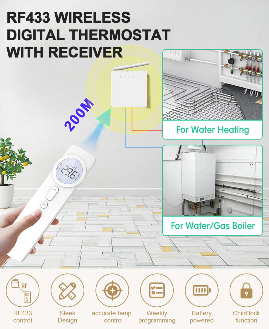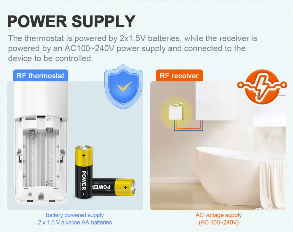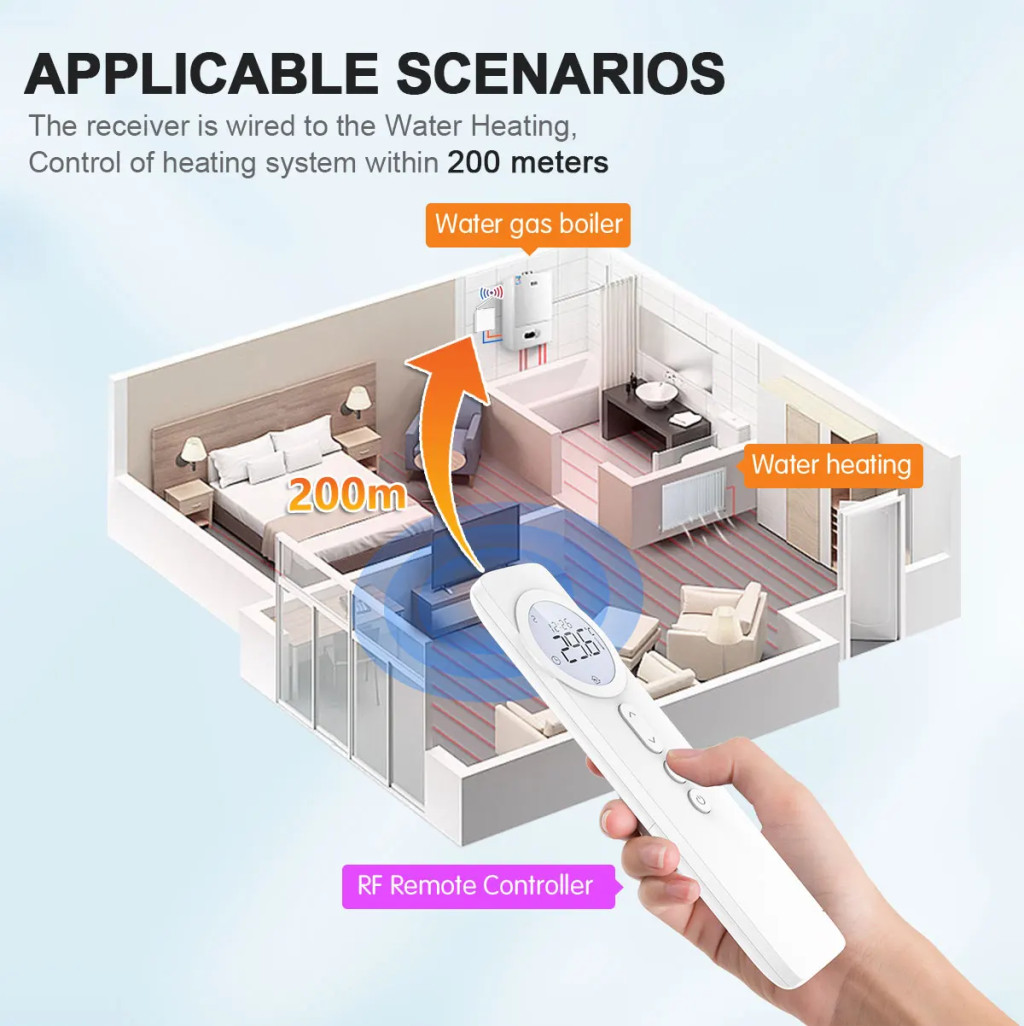 Ez egy RF433 vezeték nélküli + WiFi termosztát készlet, amely a "Smart Life" vagy a "Tuya Smart" alkalmazáson keresztül vezérelhető okostelefonról. Előnye a vevőegység és a termosztát közötti vezeték nélküli RF kommunikációban rejlik, így a vízmelegítés akár 200 méteres hatótávolságon belül is vezérelhető. Nagy pontosságú érzékelőchippel rendelkezik a hagyományos termosztátokhoz képest pontosabb hőmérsékletméréshez és -beállításhoz. Ez a fokozott kényelem nemcsak a közérzet javítását segíti elő, hanem az energiaköltségek csökkentéséhez is hozzájárul.