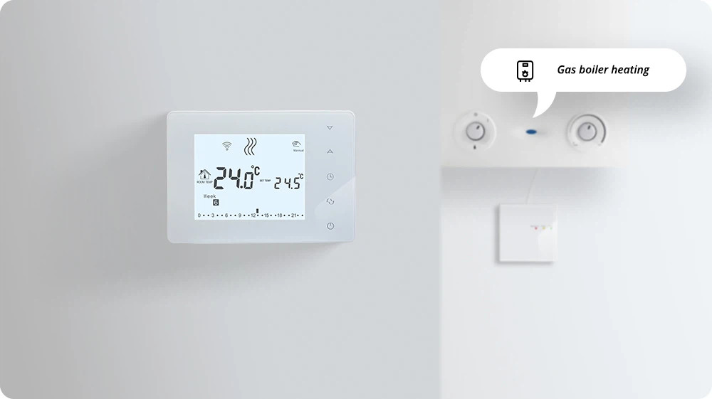 A BOT-X306 RF vezeték nélküli termosztát gázkazán fűtési rendszerhez használható, és csak elemmel működik. A termékkészletek vezérlőt és vevőt tartalmaznak, a gázkazánnak csatlakoznia kell a vevőhöz. Ez egy 433 MHz-es frekvenciájú vezeték nélküli vezérlő, és a vezérlő és a vevő közötti távolság körülbelül 30 méter. A BOT-X306 szobatermosztátunkat gázkazános fűtési rendszerhez tervezték. A nagy képernyőnek köszönhetően gyorsan leolvashatja és beállíthatja a termosztátot, hogy elérje az ideális kényelmes hőmérsékletet. A felhasználók beprogramozhatják a termosztátot, hogy kényelmesebb és melegebb környezetet teremtsenek a mindennapokban, különösen hideg télen.