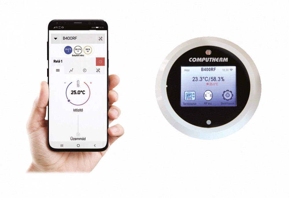 A COMPUTHERM B400RF típusú Wi-Fi termosztát egy interneten keresztül okostelefonról, tabletről és számítógépről is vezérelhető, vezeték nélküli kapcsolóüzemű készülék, melyet elsősorban a központi fűtések és elektromos készülékek vezérlésére ajánlunk. Egyszerűen csatlakoztatható bármely, kétvezetékes szobatermosztát csatlakozási ponttal rendelkező gázkazánhoz, klímaberendezéshez, egyéb elektromos készülékhez függetlenül attól, hogy az 24 V-os vagy 230 V-os vezérlőáramkörrel rendelkezik.